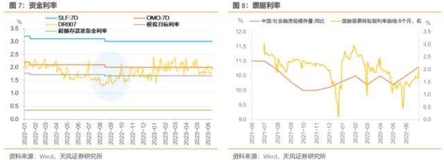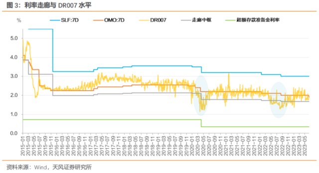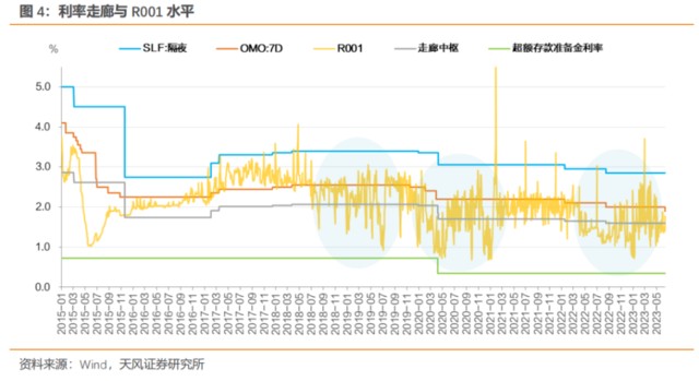 與之對應,R001 邏輯上的參考位置在最新的走廊中樞 1.55% 附近,需要注意的是,這個位置仍然高於去年 8 月降息的位置,2023 年以來雖然仍處寬鬆週期,但是資金利率中樞依然高於去年二、三季度,此中緣由值得關注。
