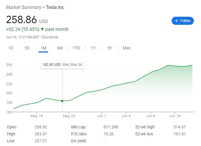 特斯拉 “股價起飛” 開始於 5 月 24 日,巧合的是,5 月 25 日福特與特斯拉宣佈達成協議,福特電動汽車買家將從 2024 年初開始得以使用特斯拉的超級充電站網絡,享受路上快速充電服務。