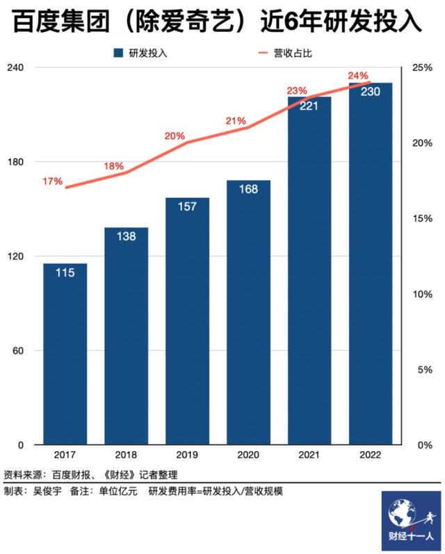過去 10 年,百度在 AI 方向投入已超過 1000 億元。百度作為一家技術公司,每年研發投入的營收佔比都超過 20%。(備註:2019 年後,百度核心研發支出的營收佔比長期超過 20%。2022 年百度研發支出率為 24%,在中國科技企業中僅次於華為的 25%。百度核心指剔除愛奇藝後的百度自有業務)但大模型也不是投一筆錢、做一個模型那麼簡單,它需要有算力、有數據、有經驗豐富的 AI 工程師在好的研發平台上長期積累。