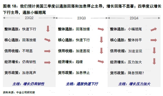 由於三季度金融流動性大概率轉弱,因此單從這個角度對美股的支撐將明顯弱於二季度。從美國宏觀環境看,我們對美國的判斷是三季度增長趨緩但不會很弱,是一個增長趨弱不能提供盈利上行支撐、但又不是很差到馬上就催生降息預期的階段,對應美債利率震盪,索性三季度核心通脹還有一波快速下行將是 “對沖項”。四季度,通脹小幅翹尾,增長壓力相對更大,屆時可以通過倒逼寬鬆預期推動美債利率下行,來實現對金融流動性量上收緊的對沖。