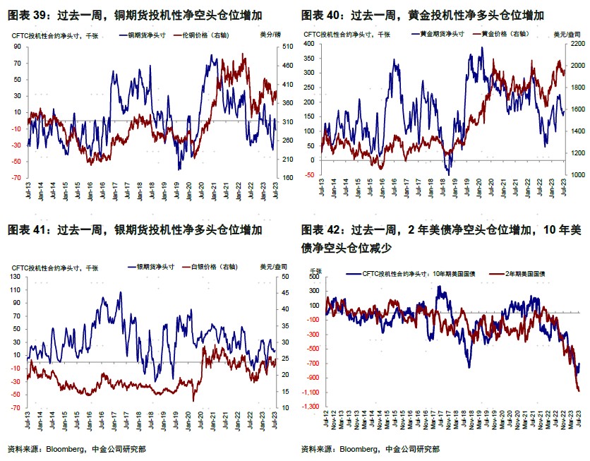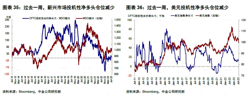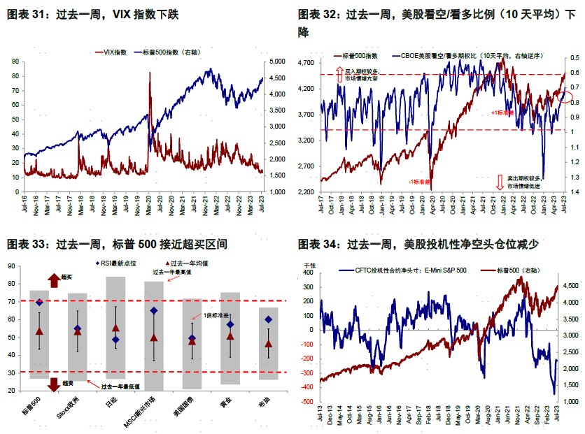 ►資產表現:股>債>大宗;利率下行,美股上漲。周初,美債利率從上週的 4% 點位小幅回落。隨後公佈的美國 6 月 CPI 數據超預期回落,整體 CPI 同比 3%,重回三字頭;核心 CPI 同比 4.8%,環比從 0.4% 放緩至 0.2%。通脹降温跡象顯著引發美債利率大幅下行,10 年期國債利率重新回到 3.8%,美股三大股指集體上漲。隔日公佈的美國 6 月 PPI 也超預期下降,同比和環比均錄得 0.1%,表明美國經濟下行壓力也進一步凸顯。但臨近週末,美國 7 月密歇根大學消費者信心指數初值錄得 72.6(預期 65.5),表明未來消費依然有一定韌性。在美債利率回落和技術性因素影響下,美元指數大幅下行跌破 100,RSI 點位已經超賣。