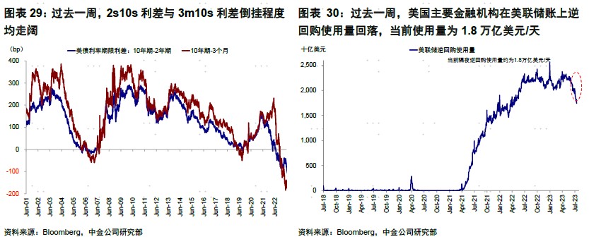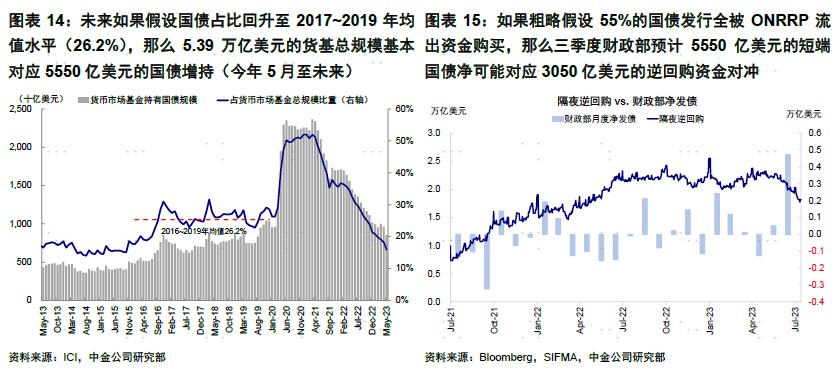 ►負債端:如果我們假設財政部不會大幅補發國債且其現金賬户的回補按照 6 月初計劃執行,那麼 9 月末 TGA 賬户將升至 6000 億美元(較當前升 880 億美元)。與此同時,考慮到債務上限的解決和市場對加息週期臨近尾聲預期的加強,貨幣基金可能會將部分資金從 ONRRP 抽離來購買新發國債。實際上,ONRRP 6 月初以來持續回落(6 月初 2.2 萬億美元 vs. 當前 1.8 萬億美元,減少 4000 億美元)。5~6 月期間 5240 億美元新發短債規模對應同期 ONRRP 回落 2910 億美元,如果粗略假設 55% 的國債發行全被 ONRRP 流出資金購買,那麼三季度財政部預計 5550 億美元的短端國債淨可能對應 3050 億美元的逆回購資金對沖。