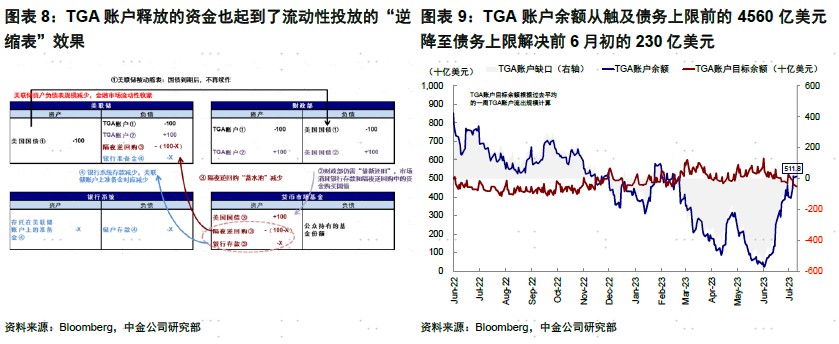 2)債務上限後財政部重新發債並累計 TGA。今年年初開始,受制於債務上限,財政部無法 “借新還舊” 暫停發債,同時也需要動用自有資金(TGA 賬户)來滿足日常支出需求(TGA 賬户餘額從債務上限前的 4560 億美元降至 6 月初債務上限解決前的 230 億美元,釋放超過 4000 億美元資金),因此債務上限也起到了流動性投放的 “逆縮表” 效果。