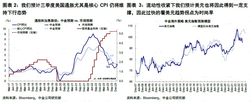 往前看,三季度美國通脹尤其是核心 CPI 或仍將維持下行態勢,但是上述金融流動性卻將迎來變化,我們預計將重新掉頭向下(銀行危機期間的短期借款將逐步到期,債務上限解決後財政部繼續發債)。這樣一正一反的局面,可能使得美股市場所得到的支撐弱於二季度,但倒也不至於像去年通脹高企時承受那麼大的壓力,介於兩者之間;美元也將因此得到一定支撐,因此過快的看美元趨勢拐點為時尚早。