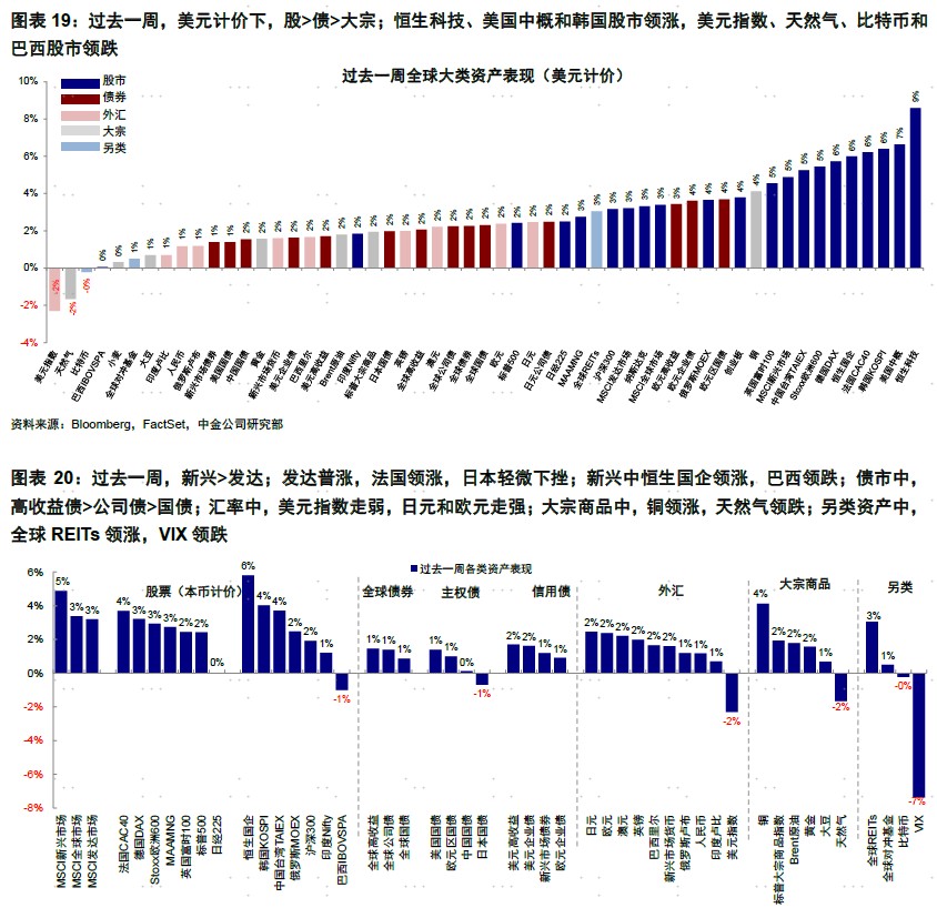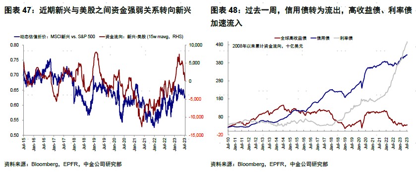 ►資金流向:股票型基金流入放緩,貨幣基金轉為流出。過去一週,債券型基金加速流入,股票型基金流入放緩,貨幣市場基金轉為流出。分市場看,中國和新興市場轉為流入,發達歐洲流出增多,日本加速流入,美國流入放緩。近期新興與美股之間資金強弱關係轉向新興。