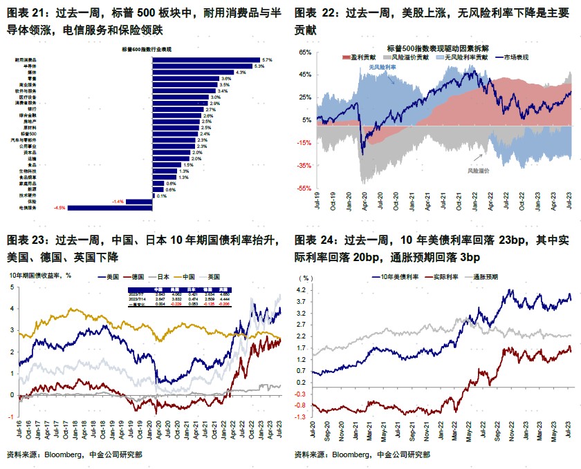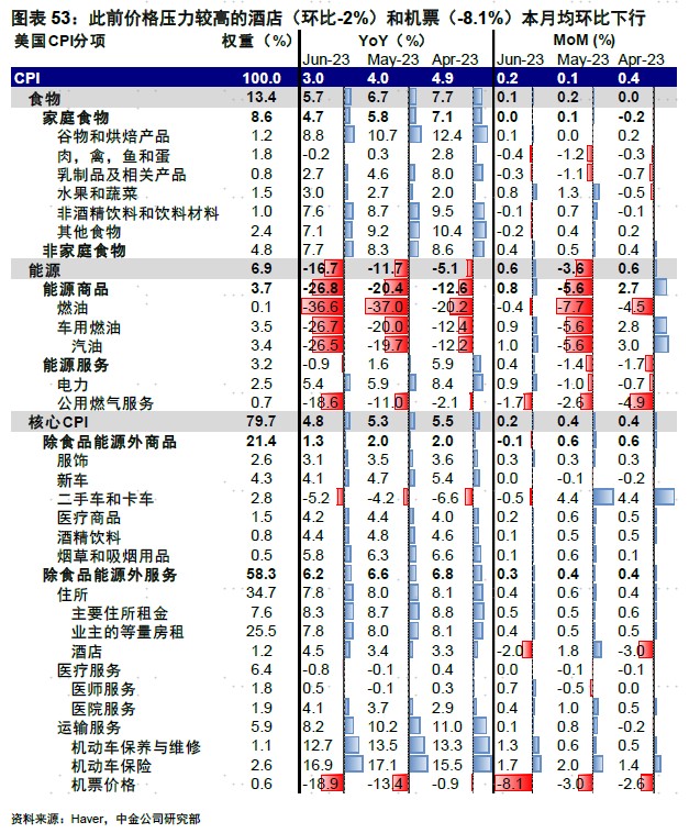 ►基本面與政策:通脹超預期回落。美國 6 月整體和核心 CPI 回落幅度均超出市場預期。美國 6 月整體 CPI 同比增 3.0%(市場預期 3.1%),為 2021 年 4 月以來新低;環比 0.2%,市場預期 0.3%。核心 CPI 同比增 4.8%(市場預期 5.0%),創 2021 年 10 月以來新低。分項來看,此前價格壓力較高的酒店(環比-2%)和機票(-8.1%)本月均環比下行,雖然能源價格環比走高推動整體 CPI 環比走高,但因為去年高基數(2022 年 6 月美國 CPI 同比高達 9.1%,也是最後一個高基數),所以不妨礙整體通脹回到 3%。從驅動原因上看,本月整體 CPI 下行得益於高基數的貢獻,基本普遍被市場預期。節奏上,7 月開始整體 CPI 基數逐月下行,因此缺乏高基數後整體 CPI 將在這一位置震盪。相反,核心 CPI 基數開始走高,接過 “接力棒” 在三季度開始快速下行,我們預計三季度末或將降至 3.5%,解決大部分通脹問題。但四季度之後,由於二者都缺乏高基數,因此可能小幅翹尾。所以,三季度或是最後一個通脹快速回落的窗口,到了四季度可能反而會小幅走高。