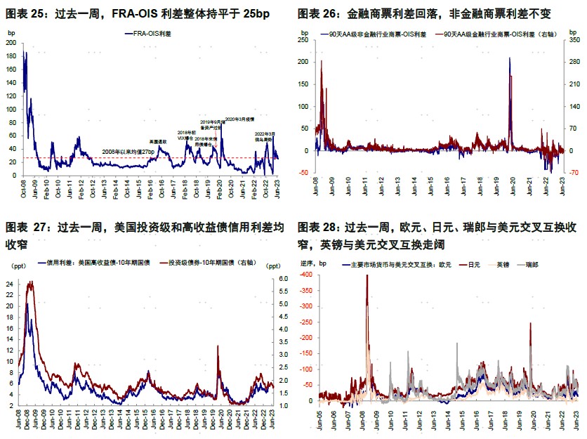 ►流動性:在岸美元流動性有所放鬆。過去一週,FRA-OIS 利差整體持平於 25bp 左右,投資級和高收益債信用利差均收窄,金融商票利差回落;衡量離岸美元流動性的指標上,歐元、日元、瑞郎與美元交叉互換收窄,英鎊與美元交叉互換走闊。美國主要金融機構在美聯儲賬上逆回購使用量回落,當前使用量為 1.8 萬億美元/天。