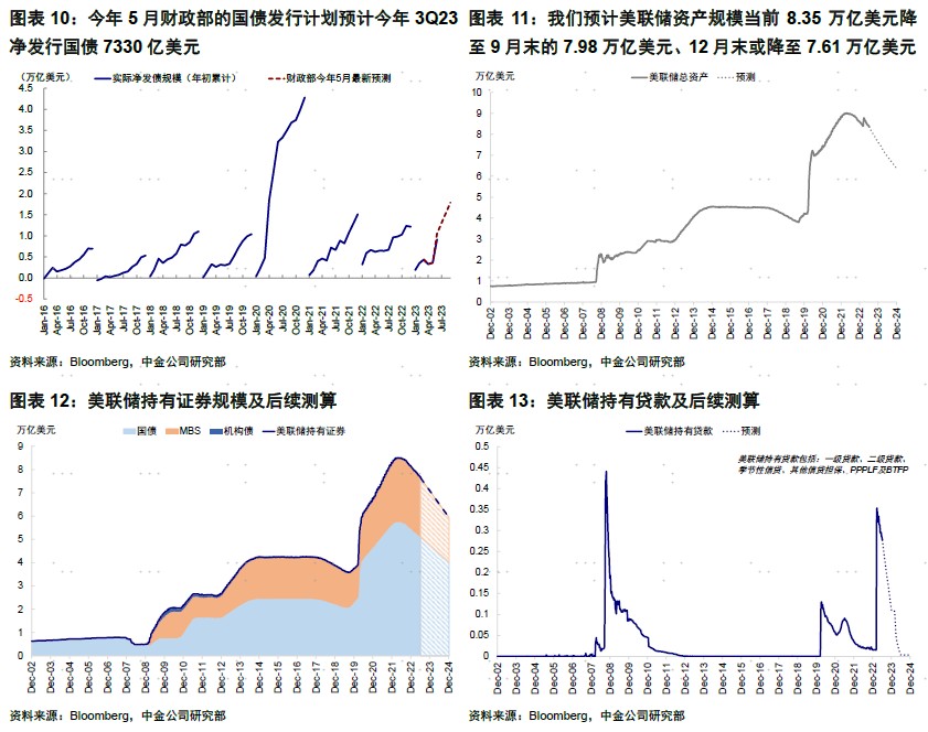 ►資產端:基於對縮表與借款到期規模的測算,我們預計美聯儲總資產將從當前的 8.35 萬億美元降至 9 月末的 7.98 萬億美元(縮減 3700 億美元)、12 月末降至 7.61 萬億美元(減少 7400 億美元)。