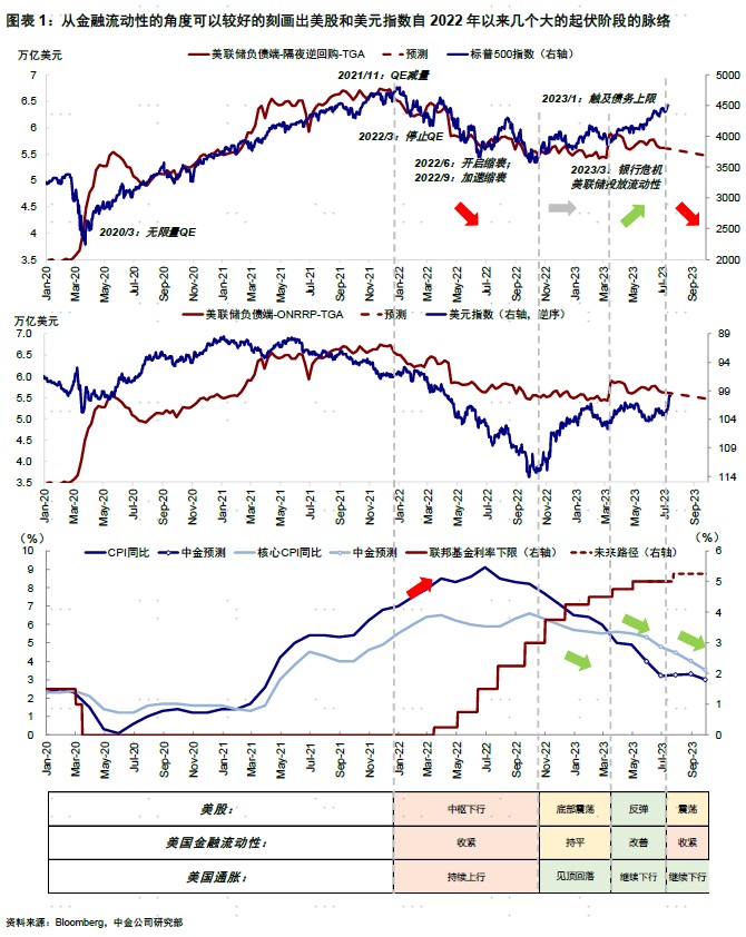 我們使用的美國金融流動性指標是美聯儲資產負債表規模,扣除吸收流動性效果的財政部發債和金融機構通過逆回購存回美聯儲賬上的資金。2022 年初以來,美股與美元走勢可以大體劃分為四個階段(2021 年 12 月~2022 年 10 月;2022 年 10 月~2023 年 3 月;2023 年 3 月~6 月;當前),恰好對應流動性指標的四個變化,如果再疊加同期通脹走勢,就基本可以很好解釋美股與美元的中期走勢。