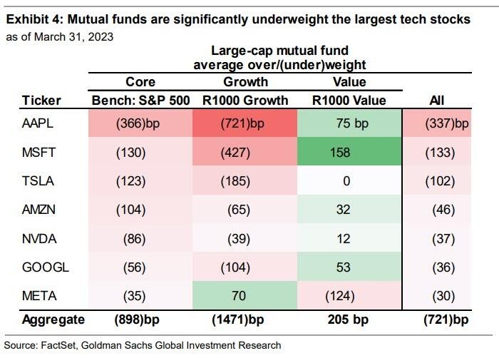 高盛指出,之前該指數最大成份股跑贏大盤且權重加大,迫使共同基金低配這些個股,反過來又損害了的回報,今年只有 31% 的大盤股基金高於基準水平。