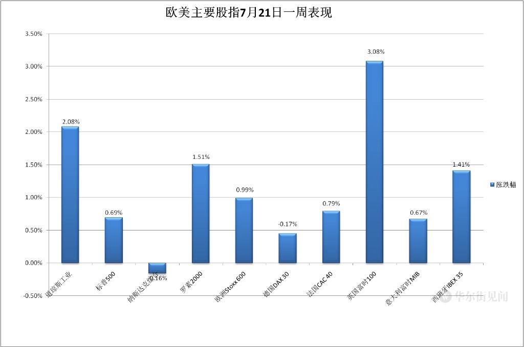 本週主要美股指漲跌各異。道指累漲 2.08%,連續第二週漲超 2%,羅素 2000 累漲 1.51%,和標普都連漲兩週。標普累漲 0.69%,遠不及漲 2.4%、創 6 月 16 日以來最大漲幅的上週。週四跌超 2% 的納指和納斯達克 100 分別累跌 0.16% 和 0.9%,在上週漲超 3%、創至少 3 月末以來最大周漲幅後回落。