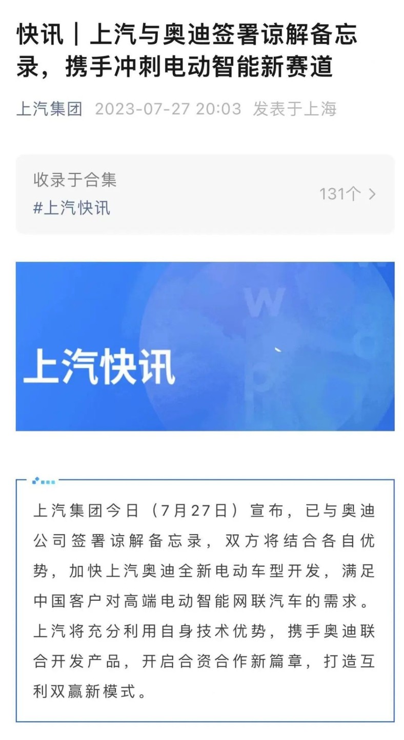 北京時間 7 月 27 日週四晚間,上汽集團官方公眾號發佈消息稱,公司已與奧迪公司簽署諒解備忘錄,加快上汽奧迪全新電動車型開發。在此次 “官宣” 中,上汽方面還表示,雙方將快速、高效地推出 “下一代電動車型”。