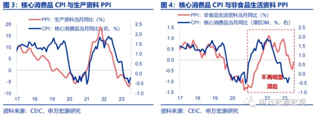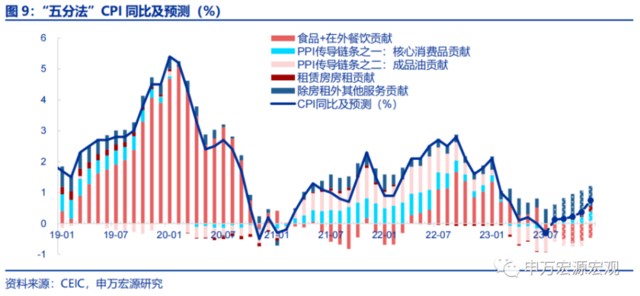 核心商品 CPI 與核心商品 PPI 均明顯反彈,地產竣工向後週期消費需求的傳導繼續顯現,PPI 供給側傳導效應開始弱化。從 22Q4 以來,PPI 快速通縮通過傳導至成品油 CPI 和核心商品 CPI,帶動整體 CPI 持續下行。