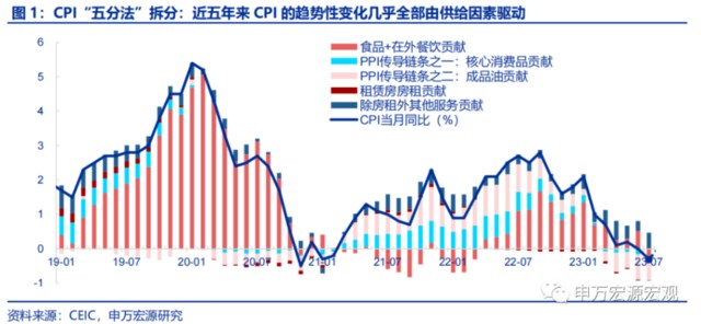 需求主導通脹只是我們理論上的 “一廂情願”,近五年來 CPI 的趨勢性變化幾乎全部由供給因素驅動。通過我們對 CPI 細項的五分法拆分,我們能夠清晰的釐清影響 CPI 的因素中,多少來自需求主導、多少來自供給主導。在 2017 年前總需求相對旺盛、貨幣政策整體偏松的階段,CPI 的變化確實主要反映需求。但 2017 年以來 CPI 變化更多由供給因素主導,尤其是 2019 年以來。豬肉供給驅動的食品 CPI 與 PPI 驅動的成品油和核心商品 CPI,幾乎主導了整體 PPI 的所有走勢。譬如 2020 年 1 月 5.4% 的 CPI 和 2022 年 9 月 2.8% 的 CPI,而 22Q4 至今 CPI 的持續回落,恰恰在於之前形成支撐的 PPI 傳導效應和食品 CPI 對應明顯弱化,7 月 CPI 回到了類似 2020 年底-0.5% 的水平,結構貢獻也較相似,但當時經濟可是過熱狀態,沒人討論通縮風險。