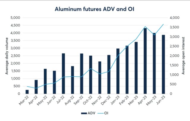 芝商所鋁期貨合約流動性強勁,特別是在價差方面,並且越來越多地被用作尋求管理鋁價風險的買家、生產商和貿易商的對沖工具。