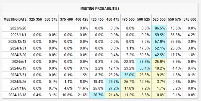 通脹穩步放緩,進一步強化了市場對美聯儲年內不再加息的預期。芝商所美聯儲觀察工具顯示,今年接下來的三次議息會議上,美聯儲不加息的概率分別達到 87%、60% 和 58%(看下圖)。