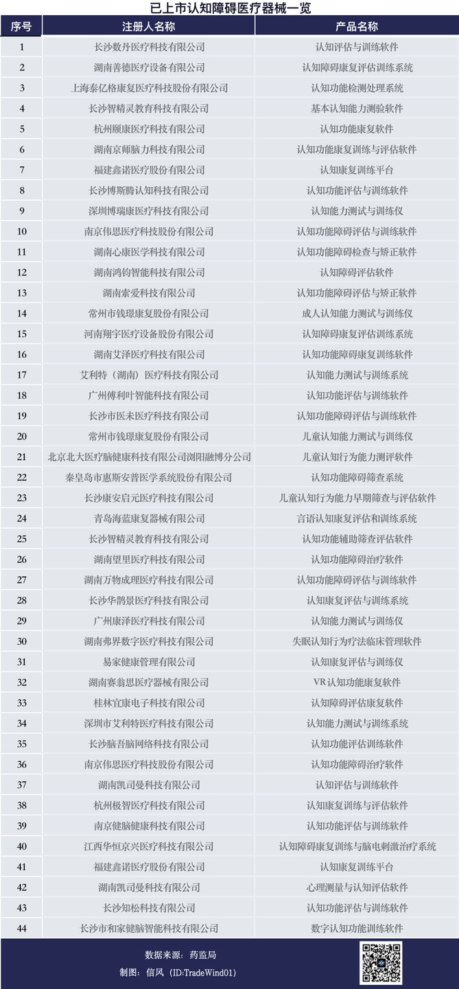 信風(ID:TradeWind01)據藥監局數據不完全統計,湖南善德醫療設備有限公司的 “認知障礙康復評估訓練系統”、杭州頤康醫療科技有限公司的 “認知功能康復軟件”、上海泰億格康復醫療科技股份有限公司 “認知功能檢測處理系統” 等不少於 44 款產品均涉及認知障礙數字療法。