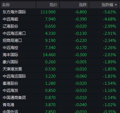 東方海外國際跌超 5.6%,中遠海控、遼港股份、中遠海運港口、招商局港口等跌幅居前。