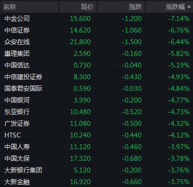 中金公司跌超 7%,中信證券、眾安在線跌超 6%.