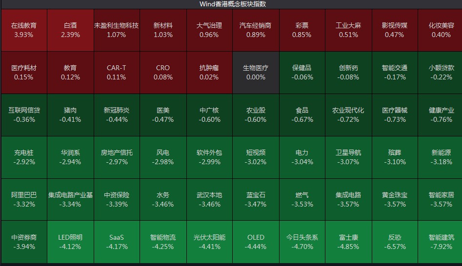 盤面上,教育、未盈利生物科技、影視傳媒領漲,地產、金融、港口物流、民航機場等跌幅居前。