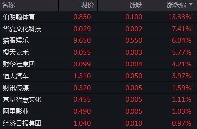 貓眼娛樂、橙天嘉禾漲約 6%,阿里影業漲逾 1%。