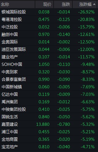 銀城國際控股跌近 27%,融創中國、金奧國際等跌超 12%,SOHO 中國跌近 9%,合景泰富、禹洲集團、寶龍地產、中駿集團跌幅居前。碧桂園跌 2.63%,盤中一度轉漲。