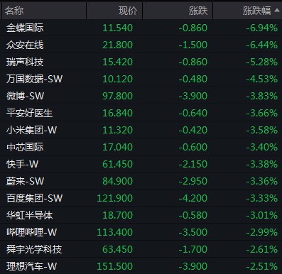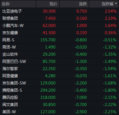 比亞迪電子、聯想漲逾 2%,小鵬汽車漲逾 1.6%,阿里巴巴、京東跌超 1%,騰訊、理想、嗶哩嗶哩跌超 2%,蔚來、快手、小米、中芯國際跌超 3%。