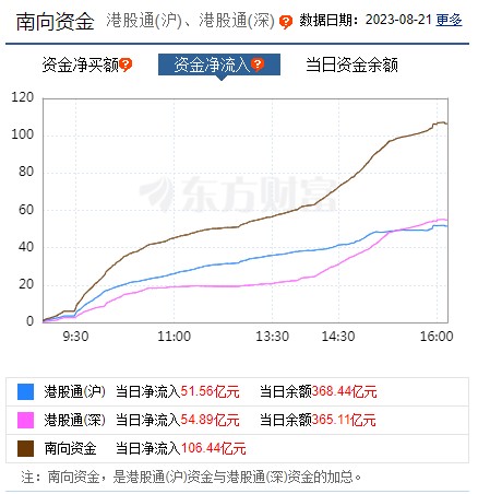 大市成交 1085.43 億港元。南向資金淨流入逾 106 億元。