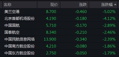 美蘭空港跌超 5%,首都機場跌超 4%,國航、南航等跟跌。