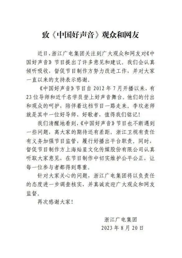 最新進展是,8 月 20 日,浙江廣電集團發文回應《中國好聲音》爭議,稱針對大家關心的問題,將進一步調查核實。浙江廣電集團表示:“我們清醒地看到,《中國好聲音》節目也不斷遇到一些問題,離大家的期待還有差距。浙江衞視有責任有義務加強節目監管,履行好播出平台職責。”