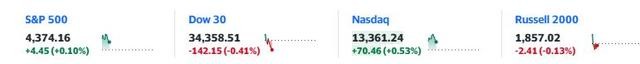 8 月 21 日週一,美股集體高開低走,開盤一小時道指和羅素小盤股已轉跌,納指較盤初漲幅 1% 砍半。