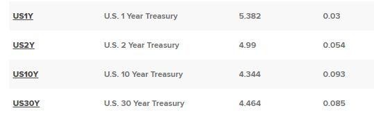 對貨幣政策敏感的兩年期美債收益率漲 6 個基點,繼續上逼 5% 關口。10 年期基債收益率漲近 10 個基點至 4.35%。衡量實際利率的 10 年期美國 TIPS 收益率漲穿 2%,為 2009 年以來首次。
