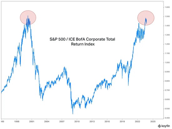 根據全球分析平台 Koyfin 的數據,今年 8 月,標普 500 指數相對於追蹤美國公司債券市場的指數,攀升至互聯網泡沫高峰時期的水平。儘管最近股市出現回調,但該指標仍保持在這些高位附近。