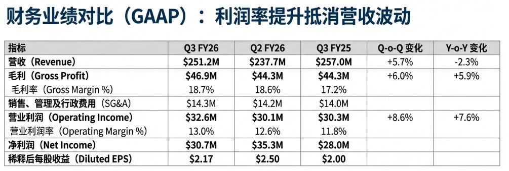 Although revenue dipped slightly by 2.3% YoY to $251 million due to project transitions, profitability strengthened: