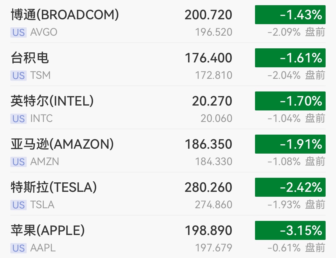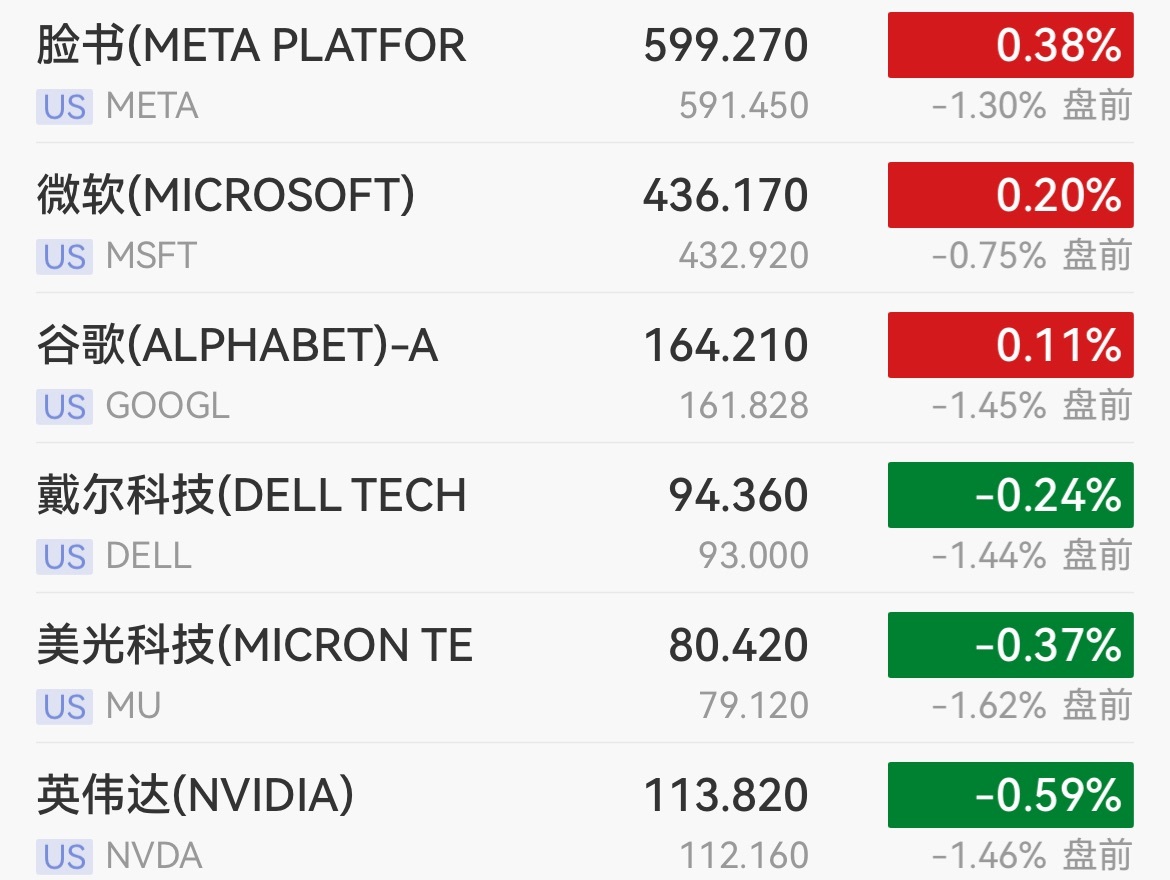 2. Most large-cap tech stocks fell in pre-market trading, Meta, Google, Micron, and Nvidia all down over 1%, Broadcom and TSMC down over 2%.