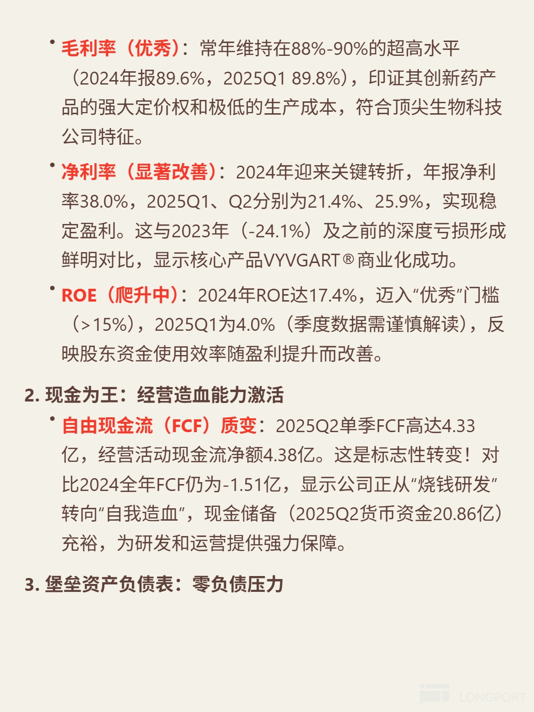 📈 Financial highlights: 2024 revenue of 2.19 billion (+78.6%), gross margin of 89.6% maintaining top-tier levels. Net profit margin turned from -24.1% in 2023 to 38%, ROE reached 17.4%. 2025Q2 single-quarter free cash flow of 433 million (2024 full year -151 million), marking the transition from burning cash to self-sustaining. Debt-to-asset ratio 15% (2025Q2), cash reserves of 2.086 billion, supporting high R&D investment (10 Phase III + 10 Phase II clinical trials). New indication CIDP is in the early stage of volume expansion, with clear long-term growth drivers.