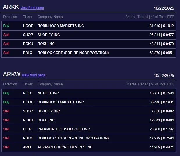 木头姐今天买入 2130 万美元 HOOD,这段时间虚拟货币走势弱,连带着相关的股也跌了下来。11 月 5 日要出财报,机构预测财报超预期。这个价位买入的确是有点吸引人。