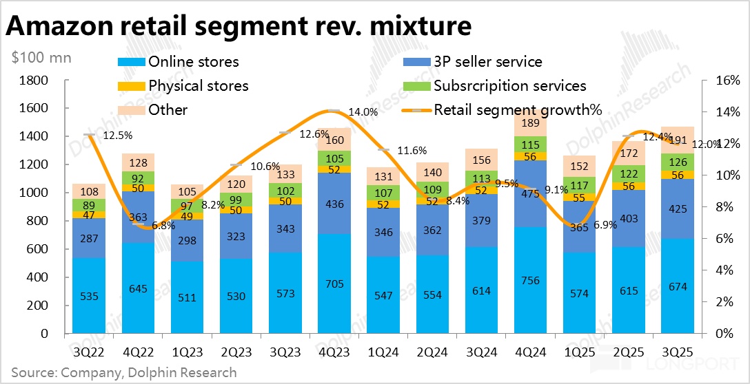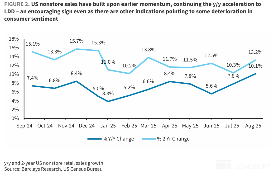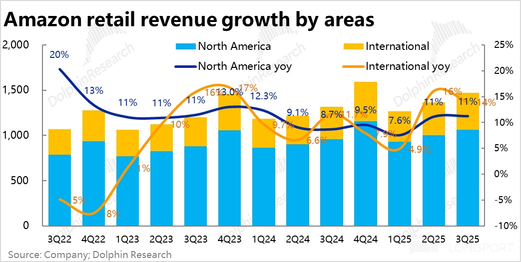 According to the U.S. Census Bureau, since June, U.S. non-store sales growth has been continuously improving, indicating that online consumption in North America remains resilient, consistent with Amazon's data trend.