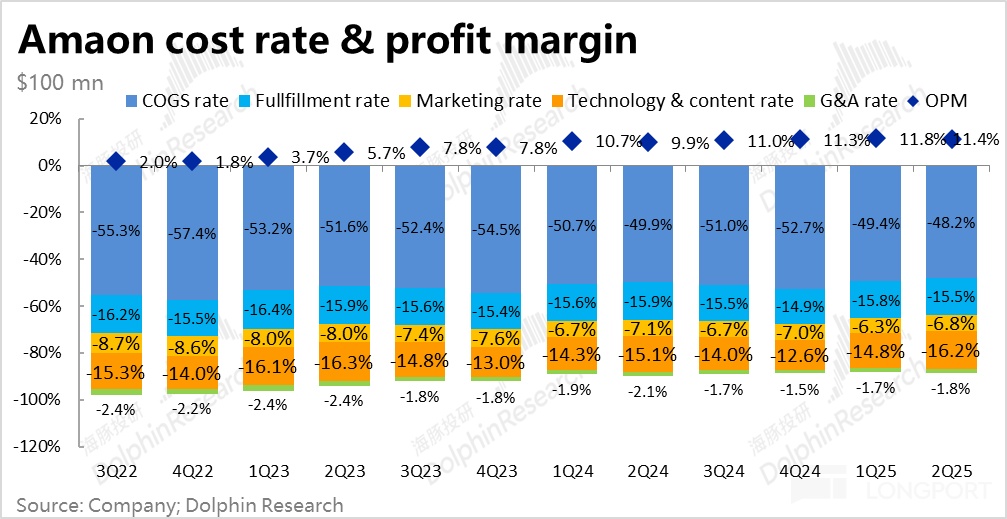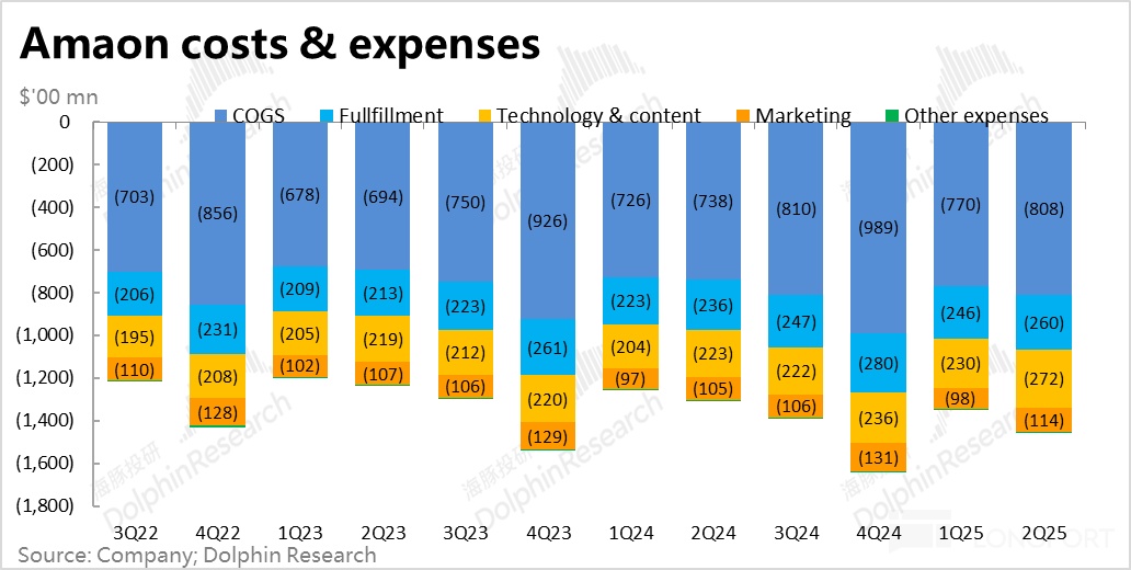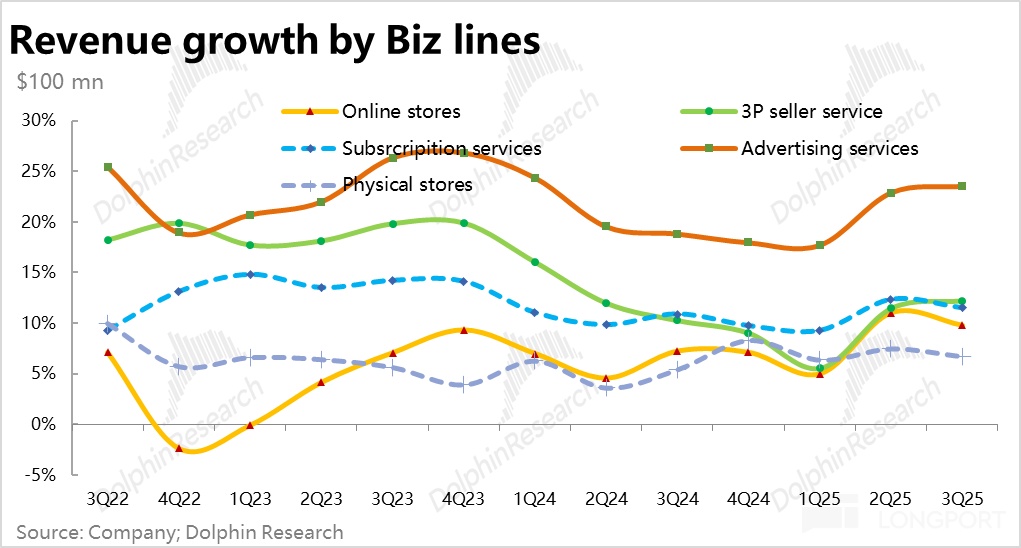 Self-operated retail, offline stores, and subscription service revenue growth slightly slowed, while advertising revenue and third-party merchant service revenue growth slightly accelerated. Notably, this quarter's advertising absolute growth rate reached 23.5%, the highest among all business lines, accelerating for three consecutive quarters. According to seller reports, strong advertising growth, besides stable e-commerce advertising, the increase in advertising on Amazon's other multimedia content such as Prime Video should be the main driving force.
