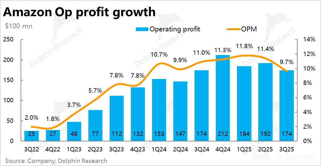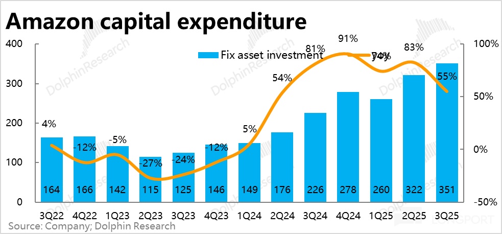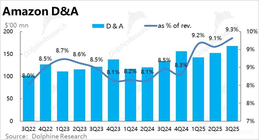 Correspondingly, this quarter, Amazon's depreciation as a percentage of revenue continued to rise, reaching 9.3%, and with further increases in Capex, the drag from depreciation may become more apparent.
