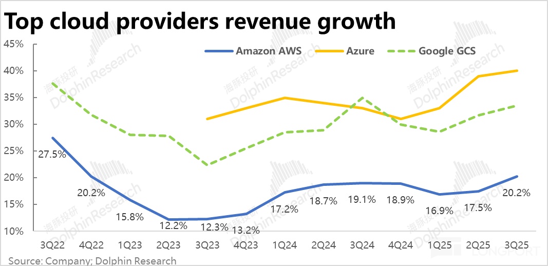 Comparing horizontally with the other two major cloud service providers, previously, while Azure and GCP's growth continued to accelerate for the past 3~4 quarters, AWS's growth stalled, which was the core reason for Amazon's stock performance significantly underperforming all other Mag7 companies recently. And this quarter, while the growth rate of the two competitors slowed down, AWS showed signs of acceleration, indicating that AWS's growth rate on the report and at the business level (especially AI-related) is narrowing.