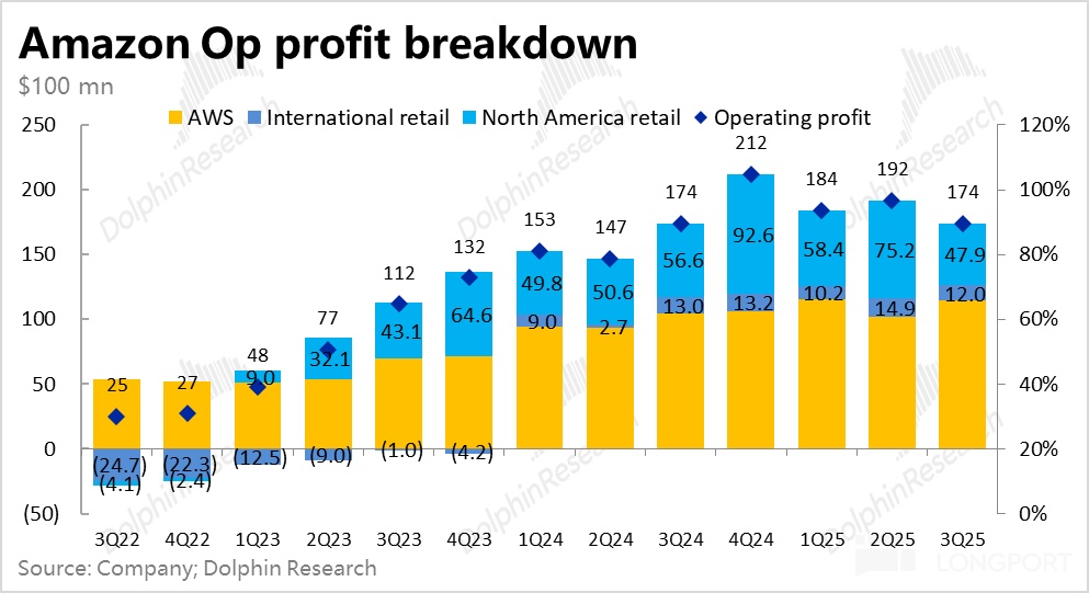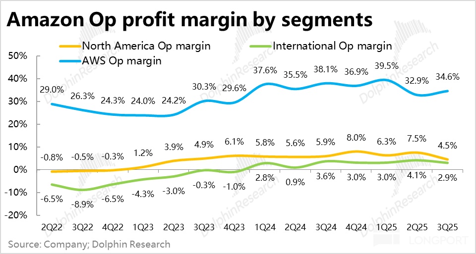 By segment, as mentioned earlier, AWS's profit margin, although declining, was roughly in line with expectations. In the retail segment, North America's operating profit, after adding back $2.5 billion in legal expenses (excluding layoff provision fees) was approximately $7.3 billion, roughly in line with market expectations, corresponding to an operating profit margin of 6.9%, still increasing by 1 percentage point year-on-year. This is a performance that meets expectations and is quite good.