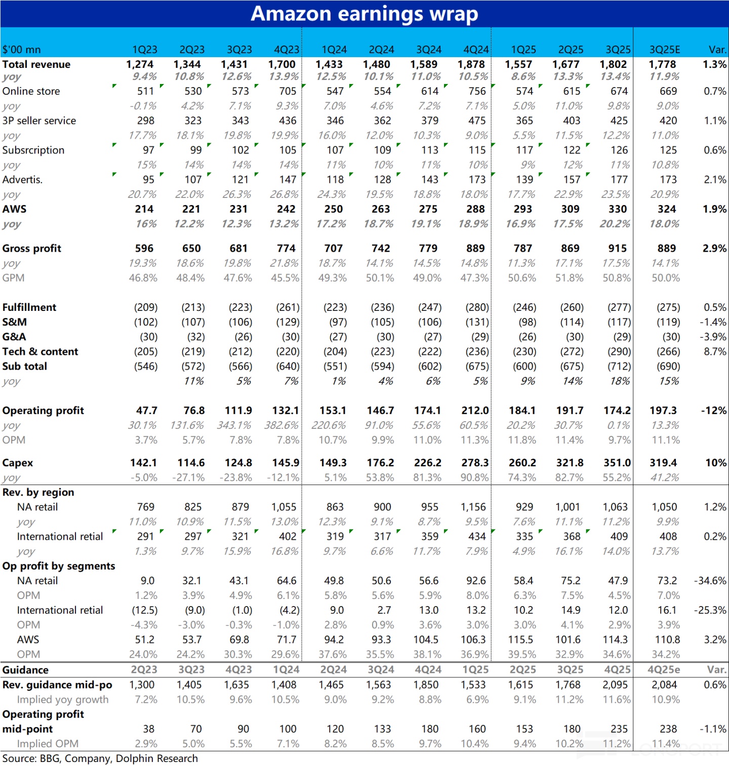 5. By segment profit: This quarter's AWS operating profit was roughly in line with expectations, but due to increased Capex and shortened server depreciation periods, the profit margin still declined year-on-year.