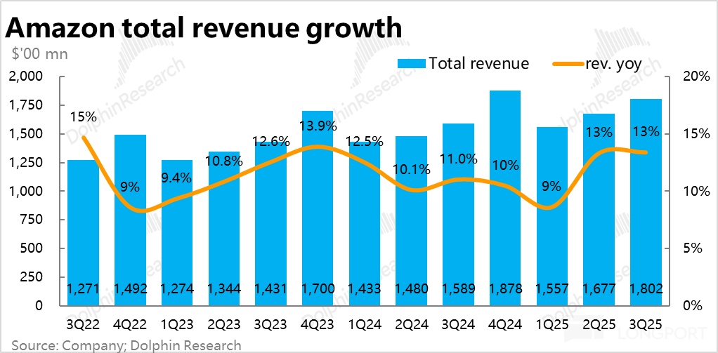 Combining all business lines, driven by AWS's outperformance and stable growth in the e-commerce segment, Amazon's total revenue this quarter was $180.2 billion, up 13.4% year-on-year, slightly accelerating by 0.1 percentage points quarter-on-quarter, also exceeding market expectations of $177.8 billion.