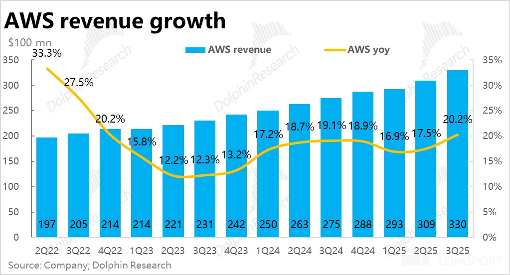 Although before the earnings report, some sellers and investors believed that AWS growth would improve this quarter, setting the expected growth rate at 18%~19%. However, this view was not a consensus, and the actual performance exceeded this expectation, providing a genuine surprise beyond expectations.