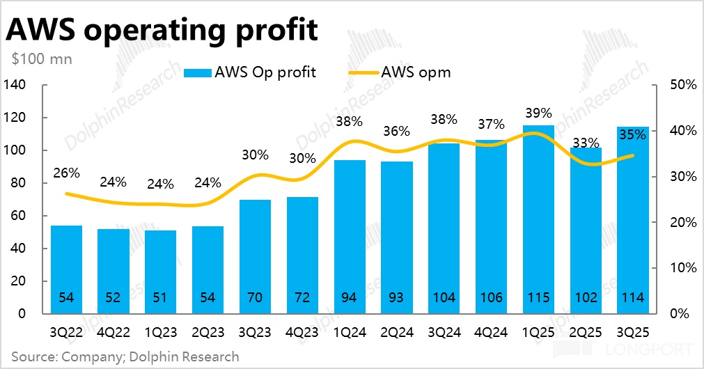 This quarter, AWS's actual operating profit was approximately $11.4 billion, although only growing by 9% year-on-year, it was still slightly better than expected.