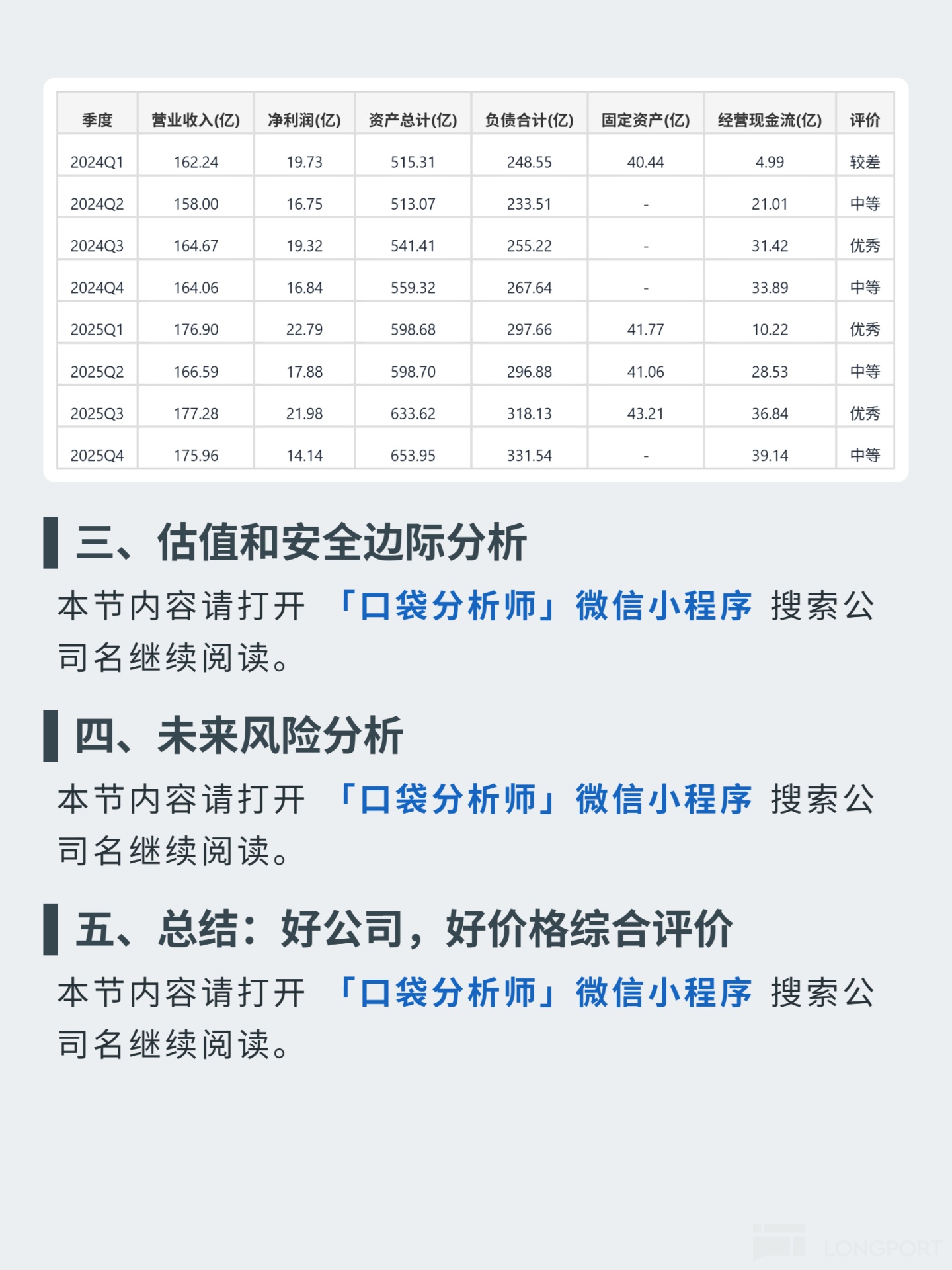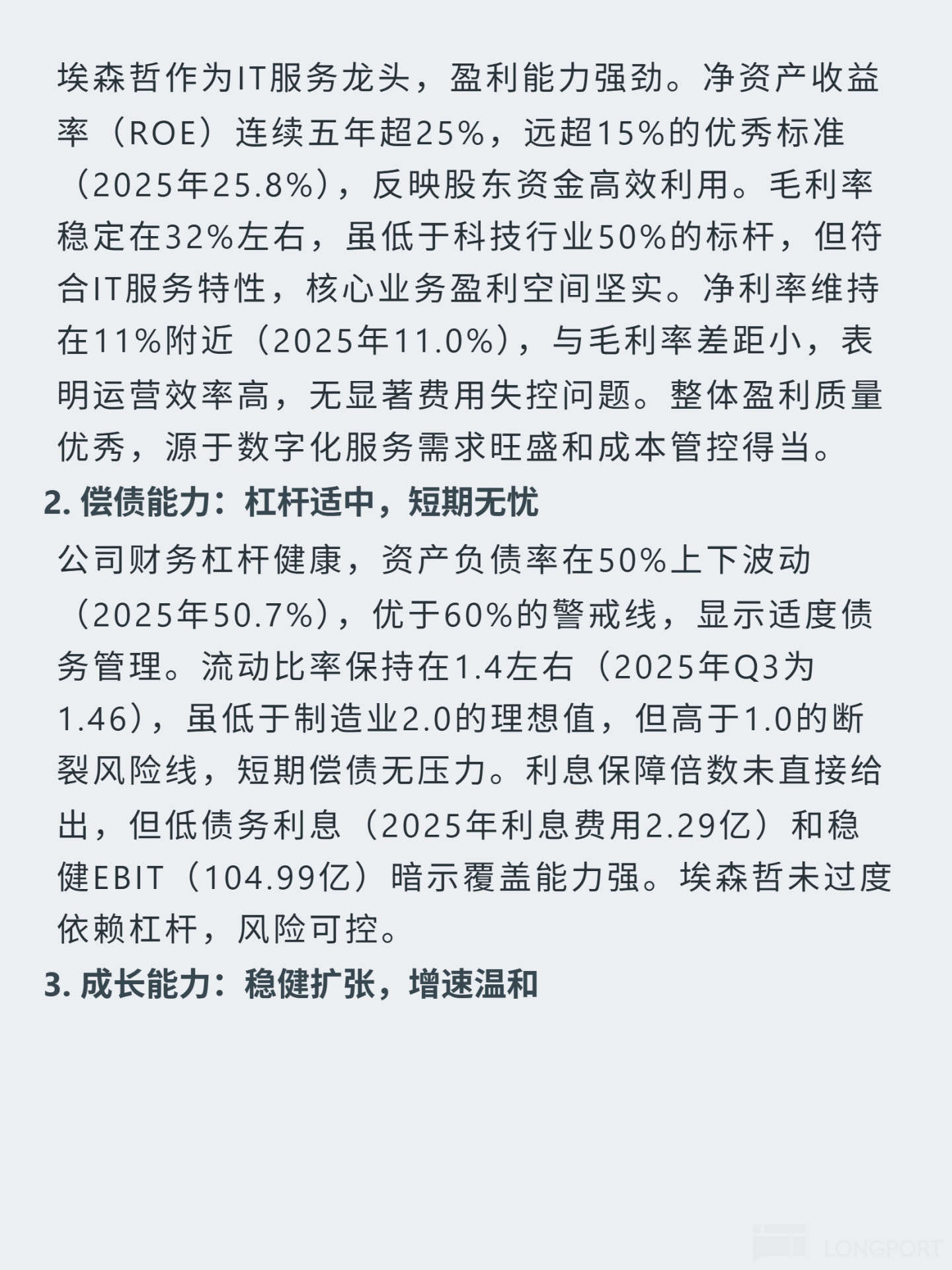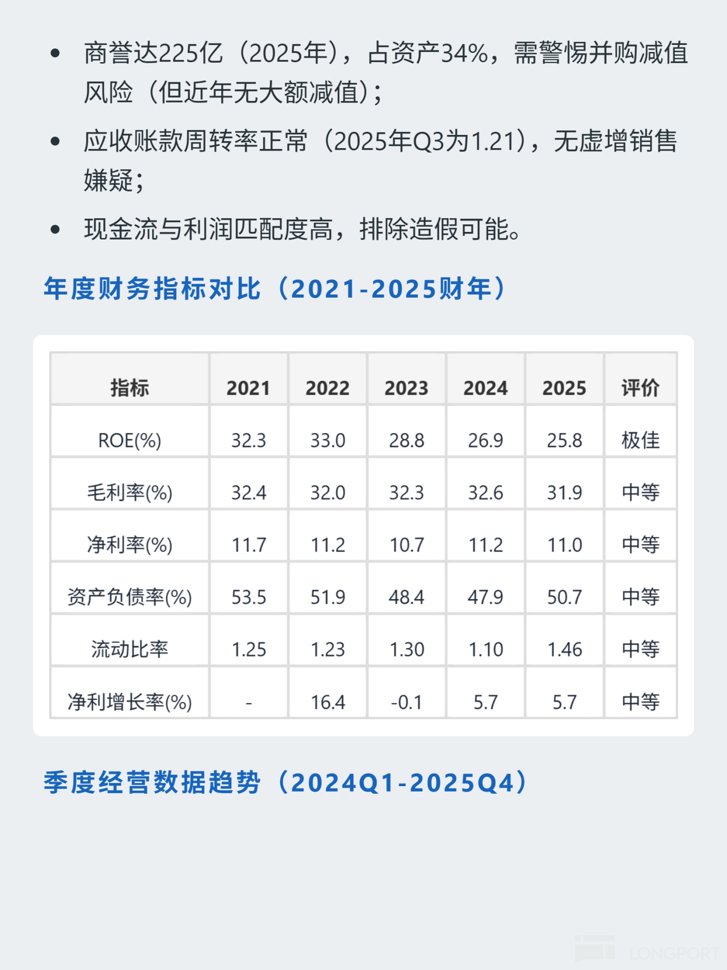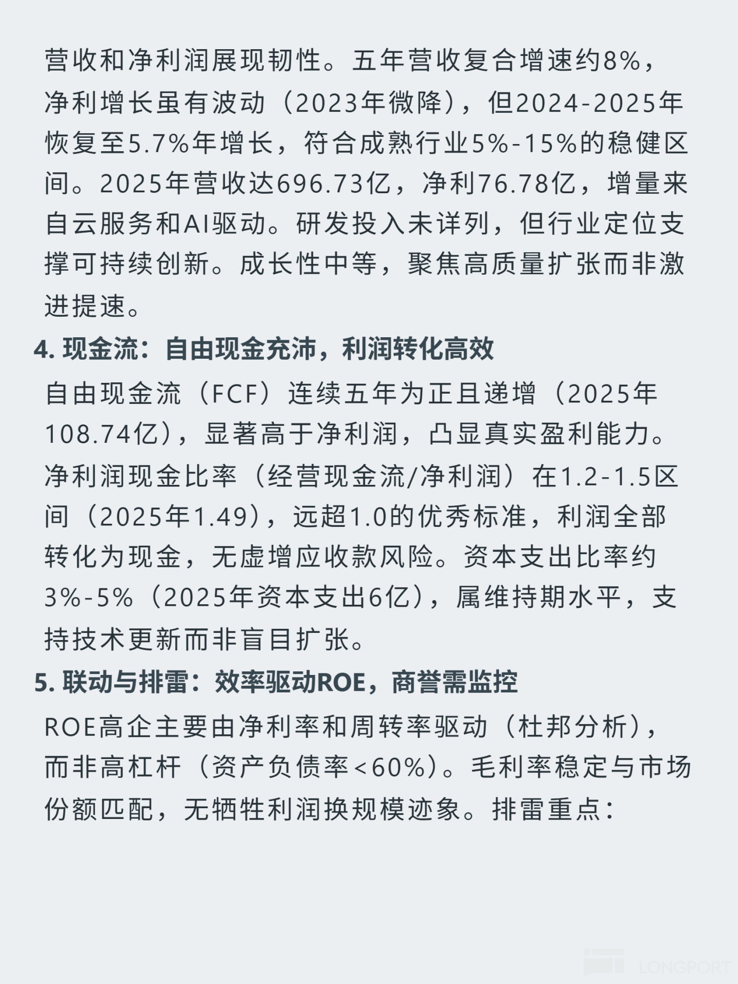 📈Financial Highlights: ROE exceeded 25% for five consecutive years (25.8% in 2025), net margin maintained around 11%, high operational efficiency; strong free cash flow (10.874 billion in 2025), net profit cash ratio of 1.49, true profit conversion; 5-year revenue CAGR of ~8%, 2025 revenue of 69.673 billion, net profit of 7.678 billion, growth driven by cloud services and AI; debt-to-asset ratio of 50.7% (2025), current ratio of 1.46, healthy financial leverage; goodwill of 22.5 billion (34% of assets) requires monitoring, but no significant impairment in recent years.