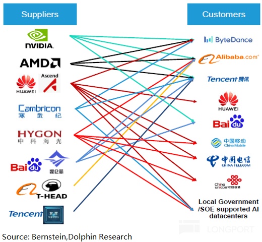 We group direct China buyers into three buckets: internet majors (ByteDance, Tencent, Alibaba, BIDU), Huawei Cloud, and telcos/enterprise Gov.-cloud (China Mobile, China Unicom, China Telecom, etc.).