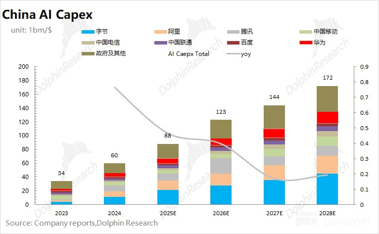 That means H200 sales become a share-of-capex question over the next two years. Based on domestic cloud capex plans and market context, Dolphin Research estimates China cloud capex could reach US$123bn in 2026 (+40% YoY).