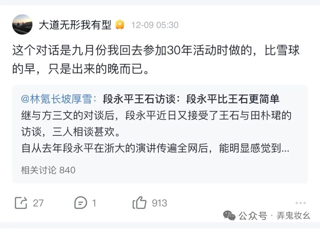 There's an interesting detail: a while ago, Snowball's founder "Abbot" also released a video of a dialogue with Duan Yongping. Although Abbot's video was released earlier, it was actually recorded later than Wang Shi's.